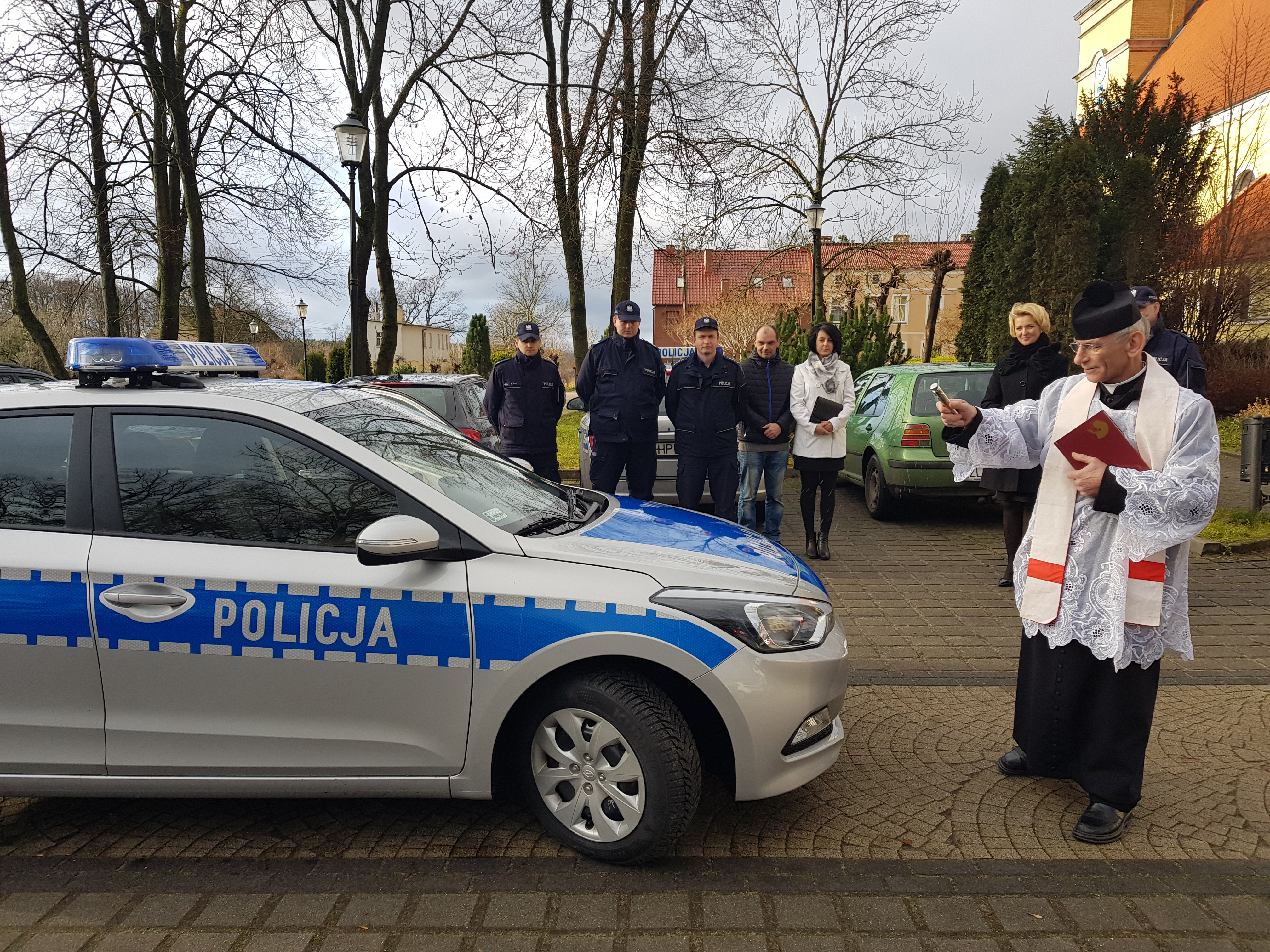 Nowy radiowóz Hyundai będzie służył węgorzyńskim funkcjonariuszom do obowiązków i działań na terenie gminy Węgorzyno. Proboszcz parafii poświęcił radiowóz aby policjanci każdego dnia bezpiecznie docierali do celu.