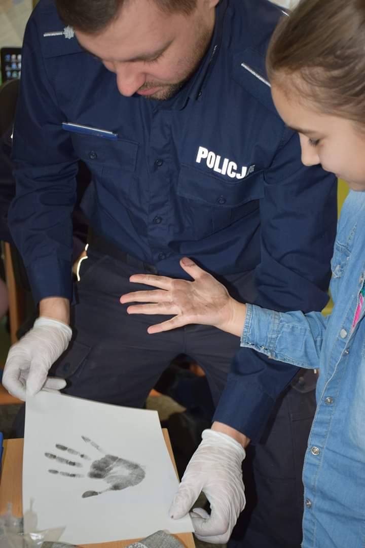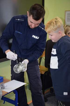 Młodzież mogła zobaczyć jak zabezpiecza się różnego rodzaju ślady na miejscu zdarzenia, odwzorować ślady w postaci linii papilarnych na kartce papieru i takie zajęcia w formie praktycznej sprawiły im wiele radości.