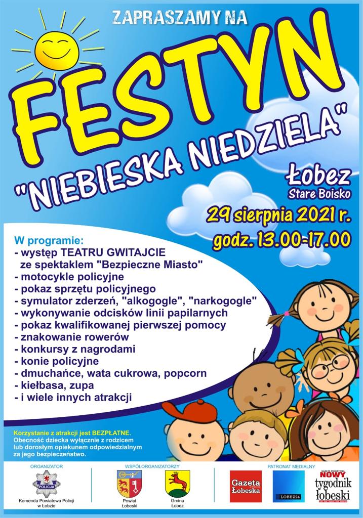 W dniu 29 sierpnia 2021 roku Komenda Powiatowa Policji w Łobzie zaprasza mieszkańców powiatu łobeskiego na festyn pod nazwą "Niebieska Niedziela", który odbędzie się w Łobzie na "Starym Boisku". Będzie mnóstwo atrakcji dla najmłodszych oraz i starszej części społeczeństwa. Współorganizatorem imprezy jest Powiat Łobeski oraz Gmina Łobez.