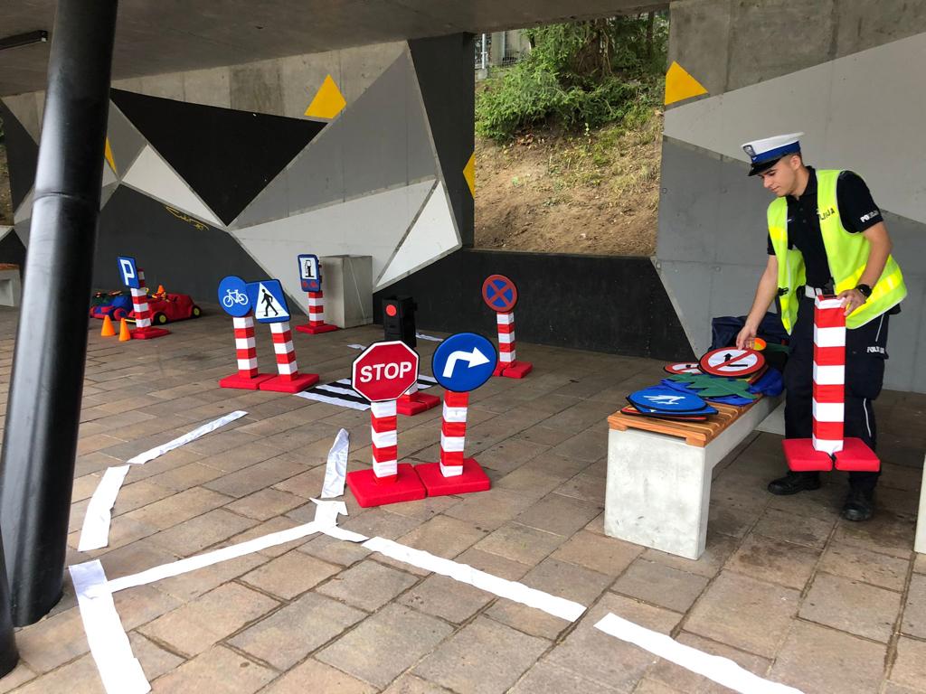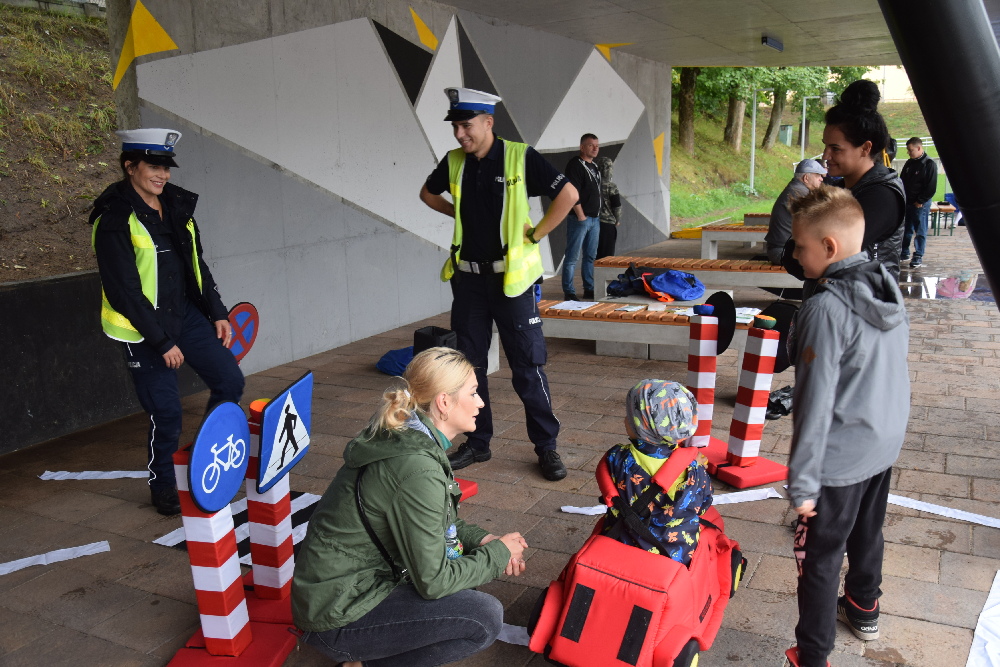 Policjanci Ogniwa Ruchu Drogowego przypomnieli dzieciom zasady poruszania się po drodze i korzystania z przejścia dla pieszych w trakcie zabawy w miasteczku tzw. autochodziku. Dużo frajdy sprawiła również możliwość wejścia do radiowozu i zobaczenia go „od środka”. Poza tym można było sprawdzić jak działa symulator zdarzeń, co nie jednego przekonało do tego, że warto korzystać z pasów bezpieczeństwa podczas jazdy. Nietypową atrakcją był też „odwrotny rower” ukazujący, jak to jest kierować pod wpływem alkoholu, a jazda na nim była nie lada wyzwaniem.