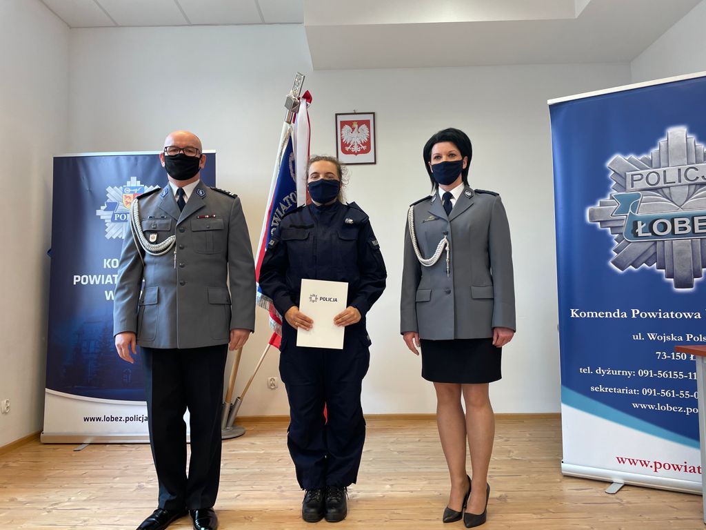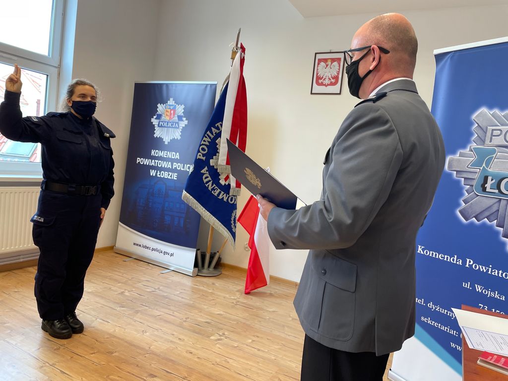 Dzisiaj odbyło się uroczyste ślubowanie w obecności Komendanta Powiatowego Policji w Łobzie insp. Leszka Nowaka, Z-cy Komendanta Powiatowego Policji w Łobzie mł. insp. Szczepana Górskiego, Komendanta Komisariatu Policji w Resku asp. szt. Edyty Klepczyńskiej, Naczelnika Wydziału Kryminalnego podinsp. Bartłomieja Deptuły, Z-cy Naczelnika Wydziału Prewencji i Ruchu Drogowego podkom. Arlety Szwacińskiej, Z-cy Naczelnika Wydziału Kryminalnego podkom. Rafała Tarnowego oraz kierownika OPI Komisariatu Policji asp. szt. Krzysztofa Wicińskiego, funkcjonariuszka wypowiedziała słowa Roty.