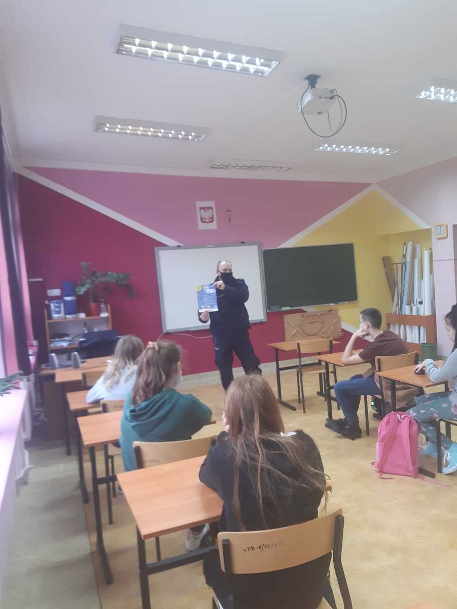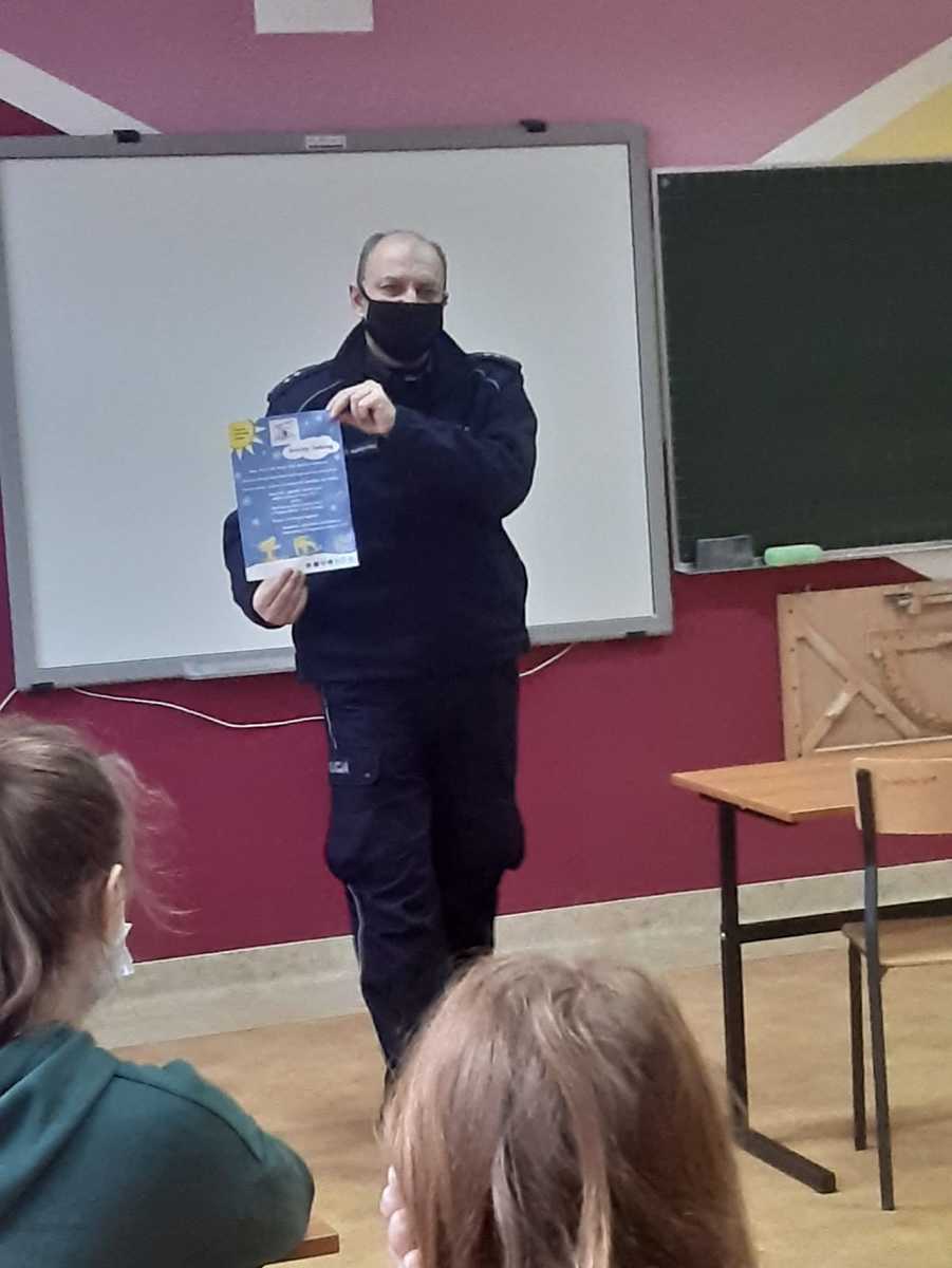 Policjanci Komendy Powiatowej Policji w Łobzie spotykają się z młodzieżą i rozmawiają na temat bezpiecznego spędzania wolnego czasu podczas ferii i unikania potencjalnych zagrożeń.