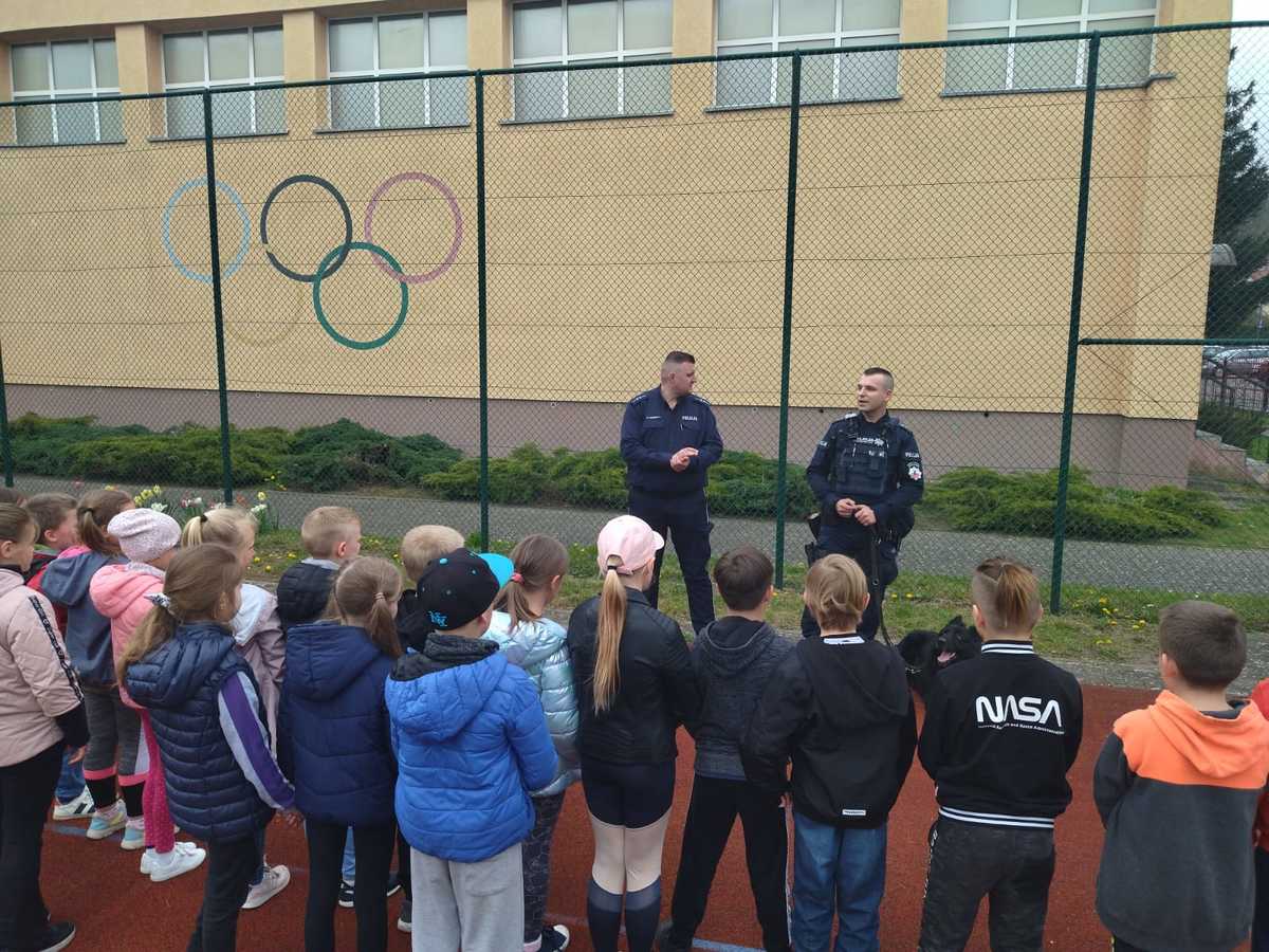 Dzielnicowy z Komendy Powiatowej Policji w Łobzie wraz z przewodnikiem psa spotkali się z dziećmi, by porozmawiać o bezpiecznych postawach w różnych dziedzinach życia