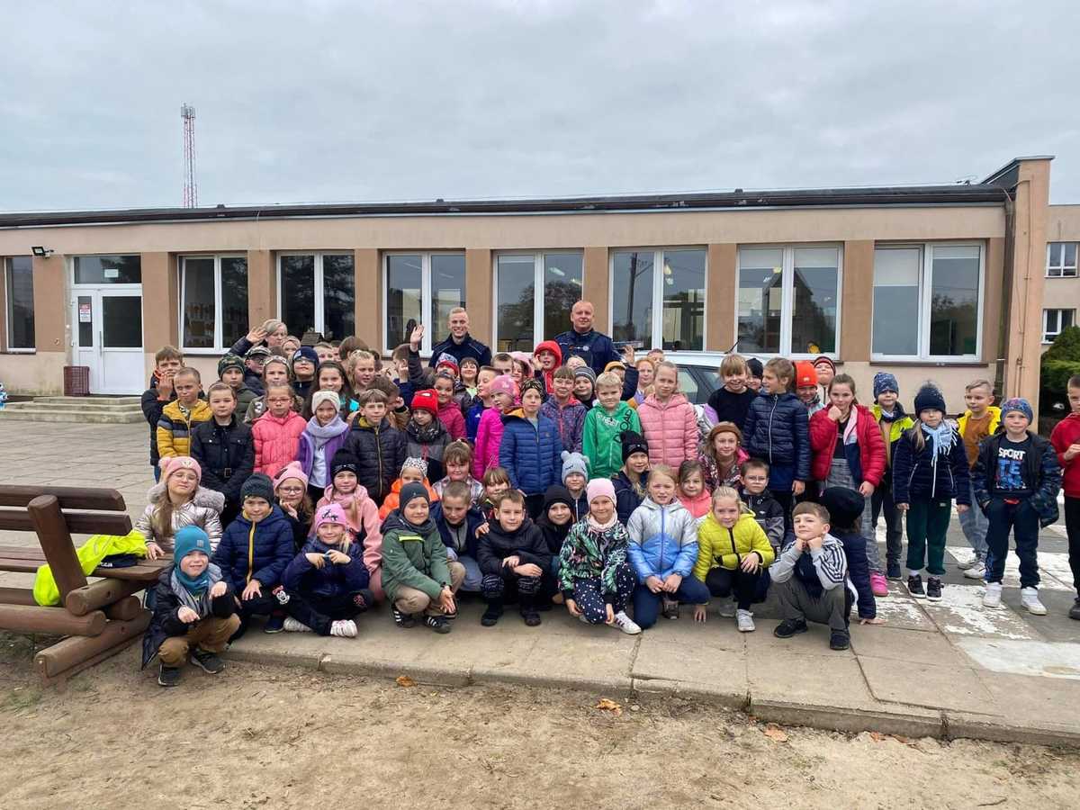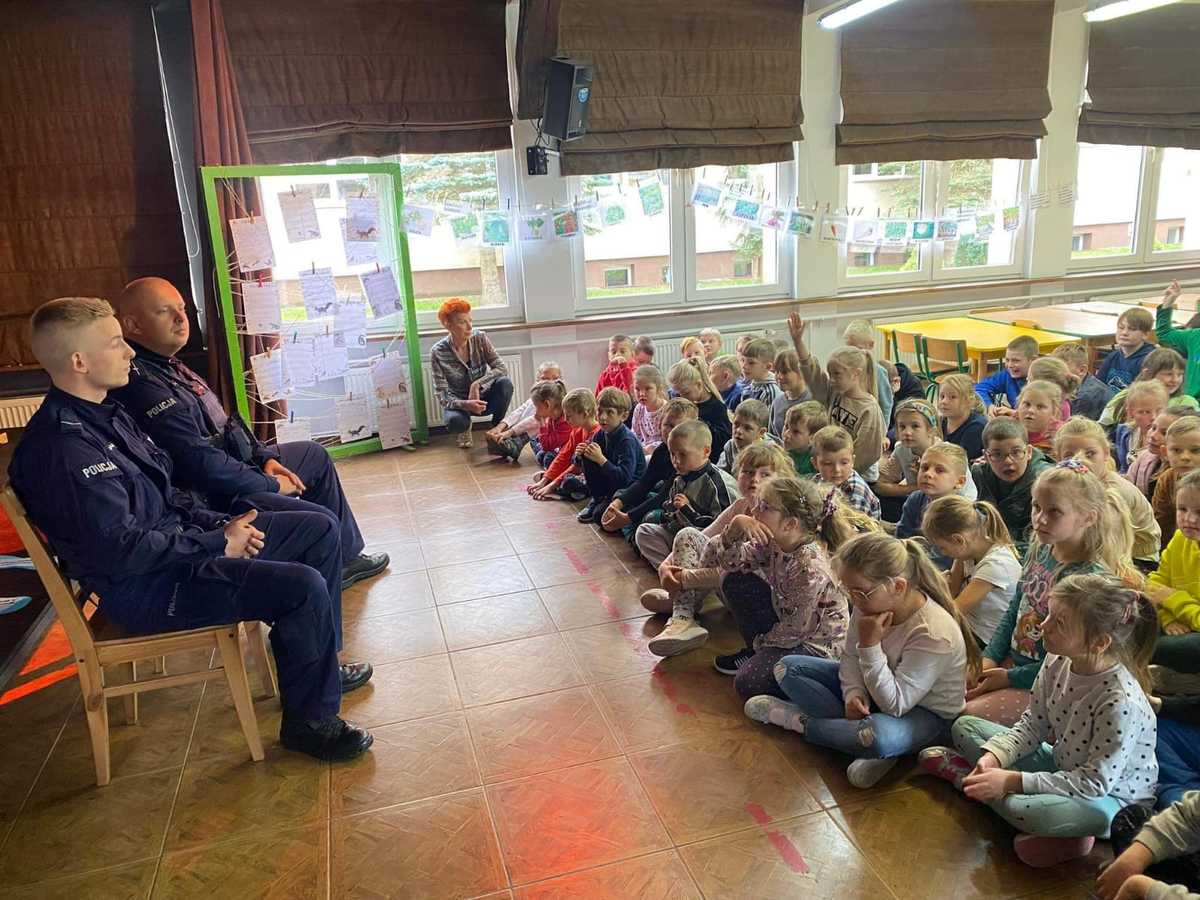 Policjanci na zaproszenie Dyrektora Szkoły Podstawowej Pana Jacka Mielcarek spotkali się z młodzieżą. W trakcie wspólnych zajęć omówione zostały zasady bezpiecznego zachowania się na drodze, a także spędzania czasu w trakcie zabaw. Przypomniane zostały numery alarmowe. Omówiono jakie informacje należy podać jeżeli wzywamy pomocy, czyli jak udzielić odpowiedzi na pytania: Gdzie? Co się stało? Komu? Ile osób? Kto dzwoni? Funkcjonariusze poinformowali również uczestników jaki jest właściwy sposób postępowania w kontaktach z nieznajomymi.