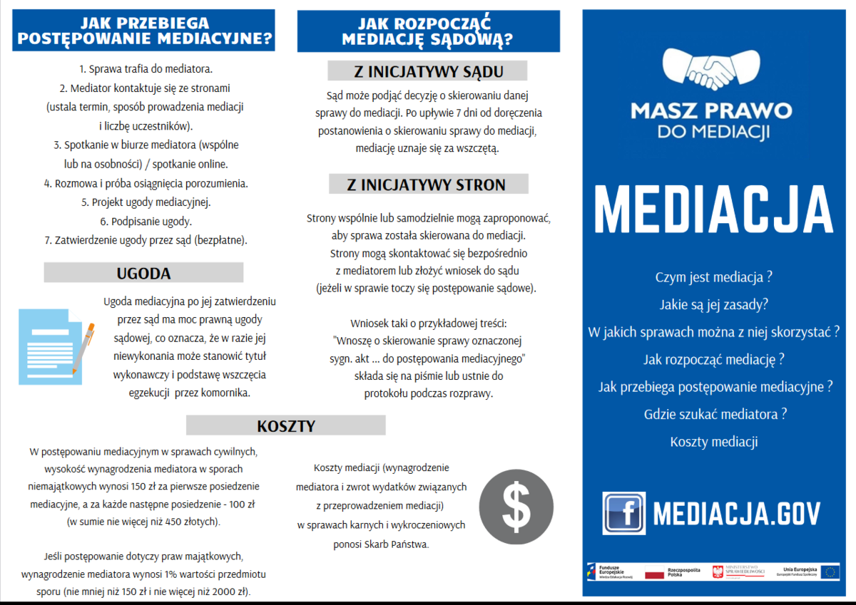Jest to alternatywny sposób na wypracowanie przez strony rozwiązania sporu, w drodze dobrowolnych, poufnych rozmów prowadzonych przy udziale bezstronnej osoby - neutralnego mediatora, który wspiera przebieg komunikacji, łagodzi napięcia i pomaga w osiągnięciu porozumienia, a także w zawarciu ugody. Przeprowadzana jest dobrowolnie, aczkolwiek przy zastosowaniu procedur prawnych. Postępowanie odbywa się poza salą sądową. Efektem mediacji jest ugoda, która w większości kategorii sporów zatwierdzona przez Sąd nadaje się do wykonania. Zaletą mediacji jest przede wszystkim szybkie zakończenie sporu.