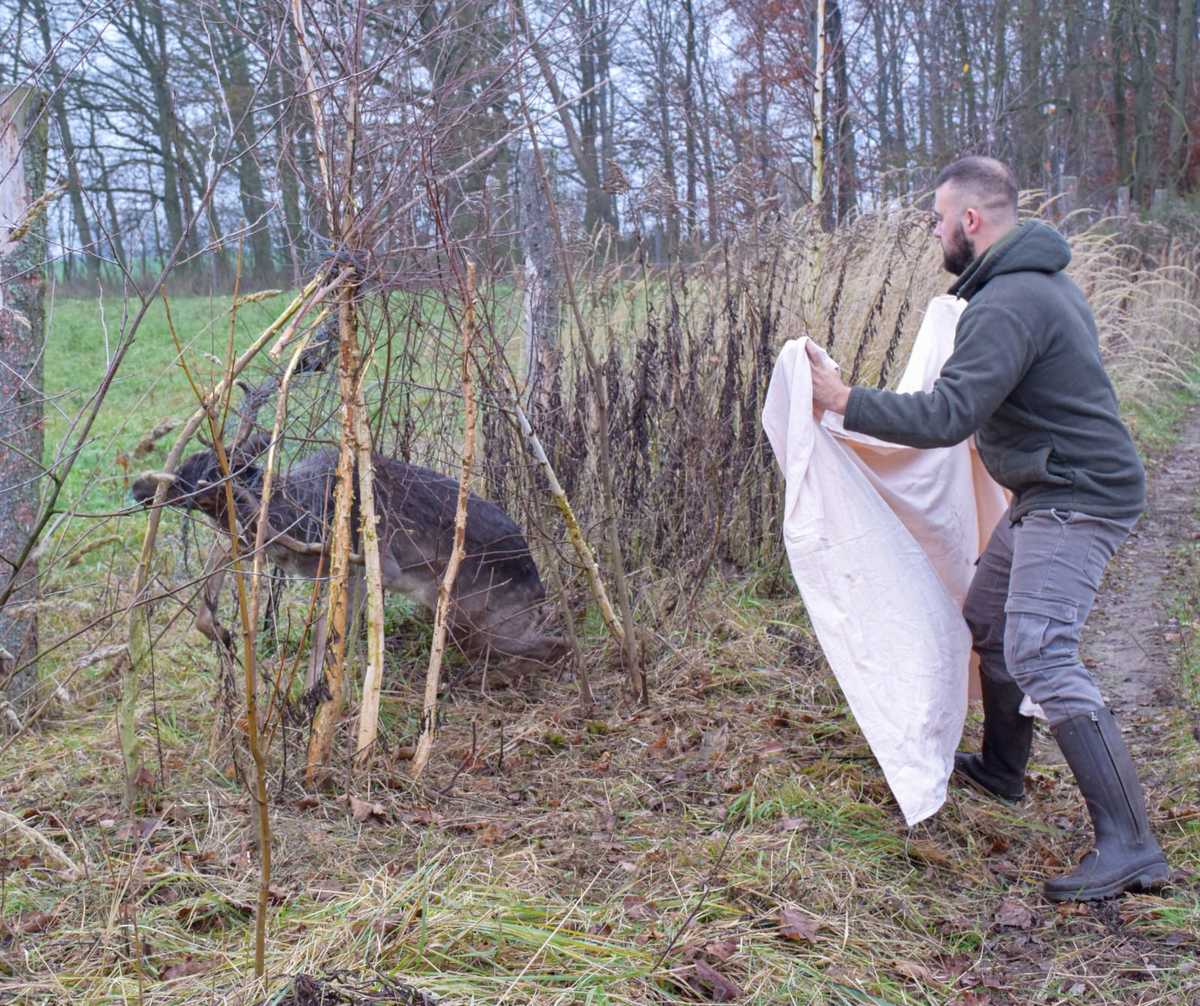 Policjanci w czasie wolnym od służby uratowali zaplątanego daniela