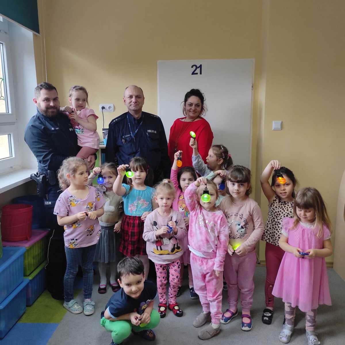 Dzielnicowi w trakcie spotkania omówili podstawowe przepisy oraz znaki drogowe, które dotyczą niechronionych uczestników ruchu drogowego. Podkreślił jak ważną rolę stanowią elementy odblaskowe dla bezpieczeństwa pieszych oraz jak prawidłowo powinno się je umieszczać na elementach odzieży. Przypomniane zostały numery alarmowe oraz algorytm postępowania w kontaktach z nieznajomymi. Ponadto mundurowi wytłumaczyli czym charakteryzuje się praca dzielnicowego i jakie są jego obowiązki. Na zakończenie spotkania dzielnicowi zaprezentowali najmłodszym wyposażenie do codziennej służby funkcjonariuszy Policji oraz wręczyli elementy odblaskowe, które będą mogli umieścić na swoim plecaku bądź odzieży.