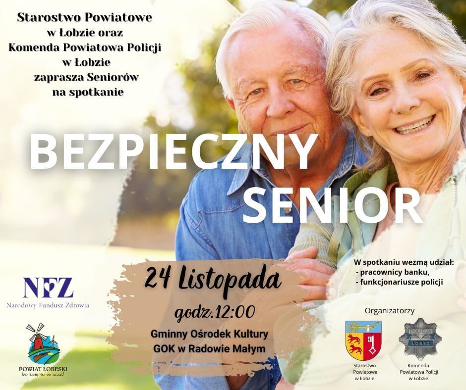 24 listopada 2023 r. wspólnie ze Starostwem Powiatowym w Łobzie serdecznie zapraszamy seniorów i nie tylko do Gminnego Ośrodka Kultury w Radowie Małym na godz. 12:00 na spotkanie pn. "Bezpieczny Senior". W spotkaniu wezmą udział pracownicy Banku PKO. BP Oddział Łobez. Stoisko z materiałami promocyjnymi udostępni również Narodowy Fundusz Zdrowia.