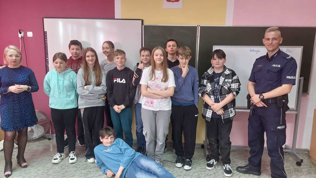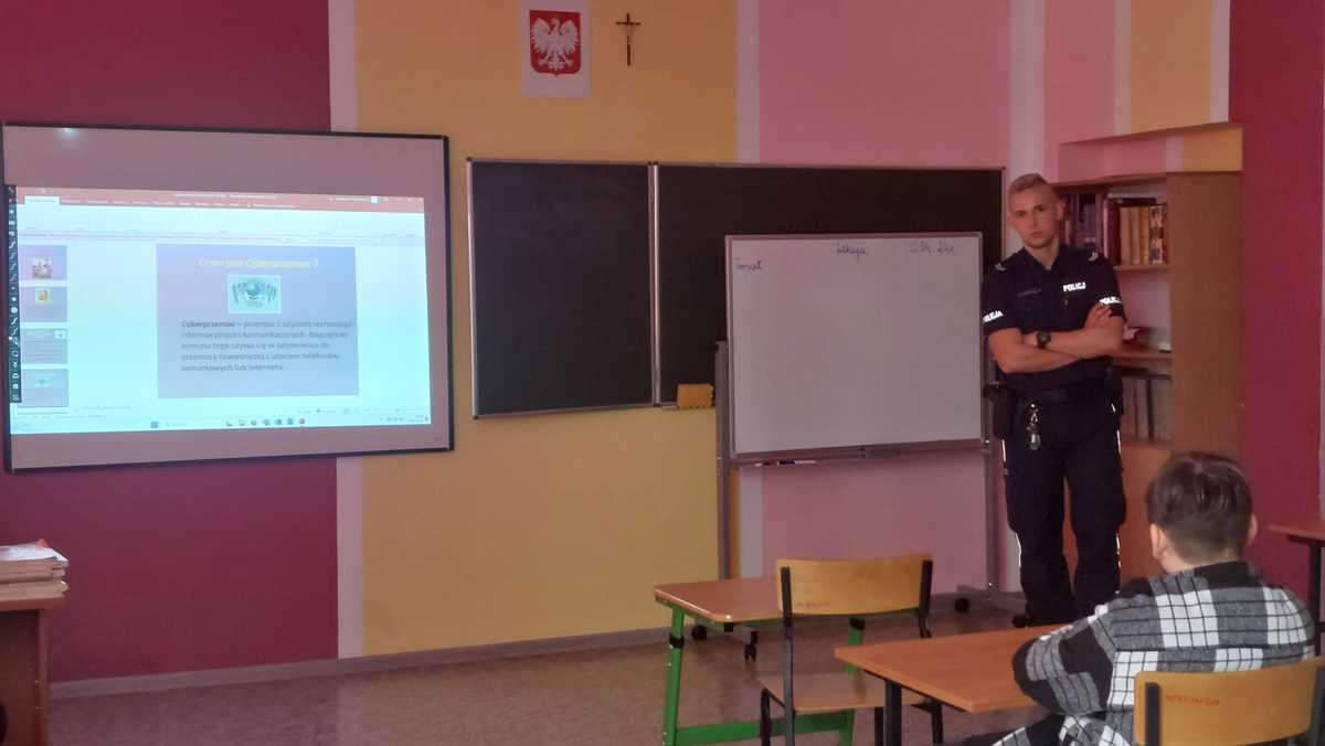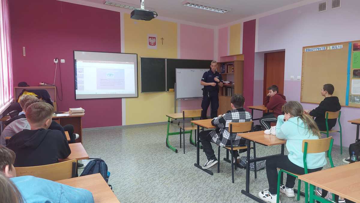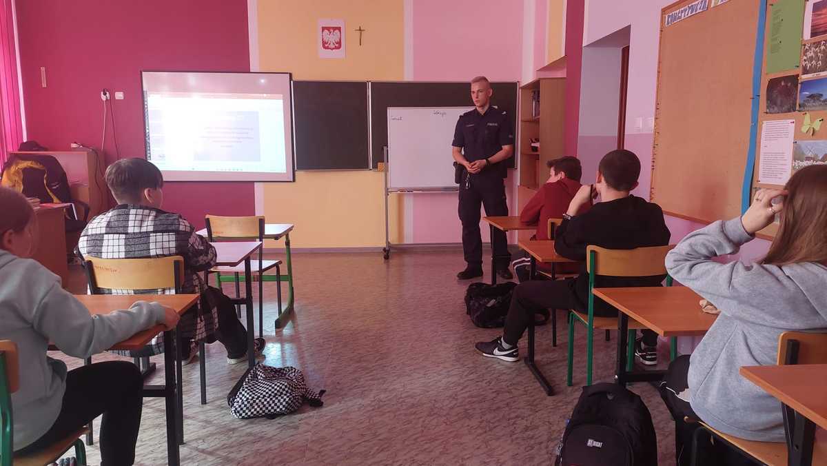 W trakcie spotkania funkcjonariusz wyjaśnił czym jest odpowiedzialność karna nieletnich, a także pojęcie nieletniego, czynu karalnego oraz demoralizacji, które wynikają z ustawy z dnia 9 czerwca 2022 r o wspieraniu i resocjalizacji nieletnich. Uczniowie dowiedzieli się o zagrożeniach, jakie można napotkać korzystając z internetu oraz mediów społecznościowych. W trakcie prelekcji mówiono o tym, że nie wolno nagrywać nikogo bez jego zgody lub robić mu zdjęć, gdyż w ten sposób możemy naruszyć dobra osobiste człowieka. Funkcjonariusz wskazał jak bronić się przed hejtem, który jest coraz częstszym zjawiskiem w wirtualnym świecie i przypomniał kwestie dotyczące bezpieczeństwa w sieci. Na spotkaniu wskazano skutki, jakie może przynieść zamieszczanie cudzych, krzywdzących zdjęć czy filmów w internecie oraz przypomniano, że nikt nie jest w sieci anonimowy.