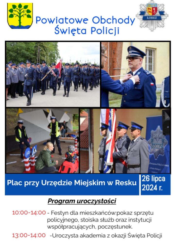 Pragniemy serdecznie zaprosić Państwa do przeżycia Naszego święta wspólnie z funkcjonariuszami Komendy Powiatowej Policji w Łobzie w dniu 26 lipca 2024 roku w godzinach 10:00-14:00 na Placu przy Urzędzie Miejskim w Resku.