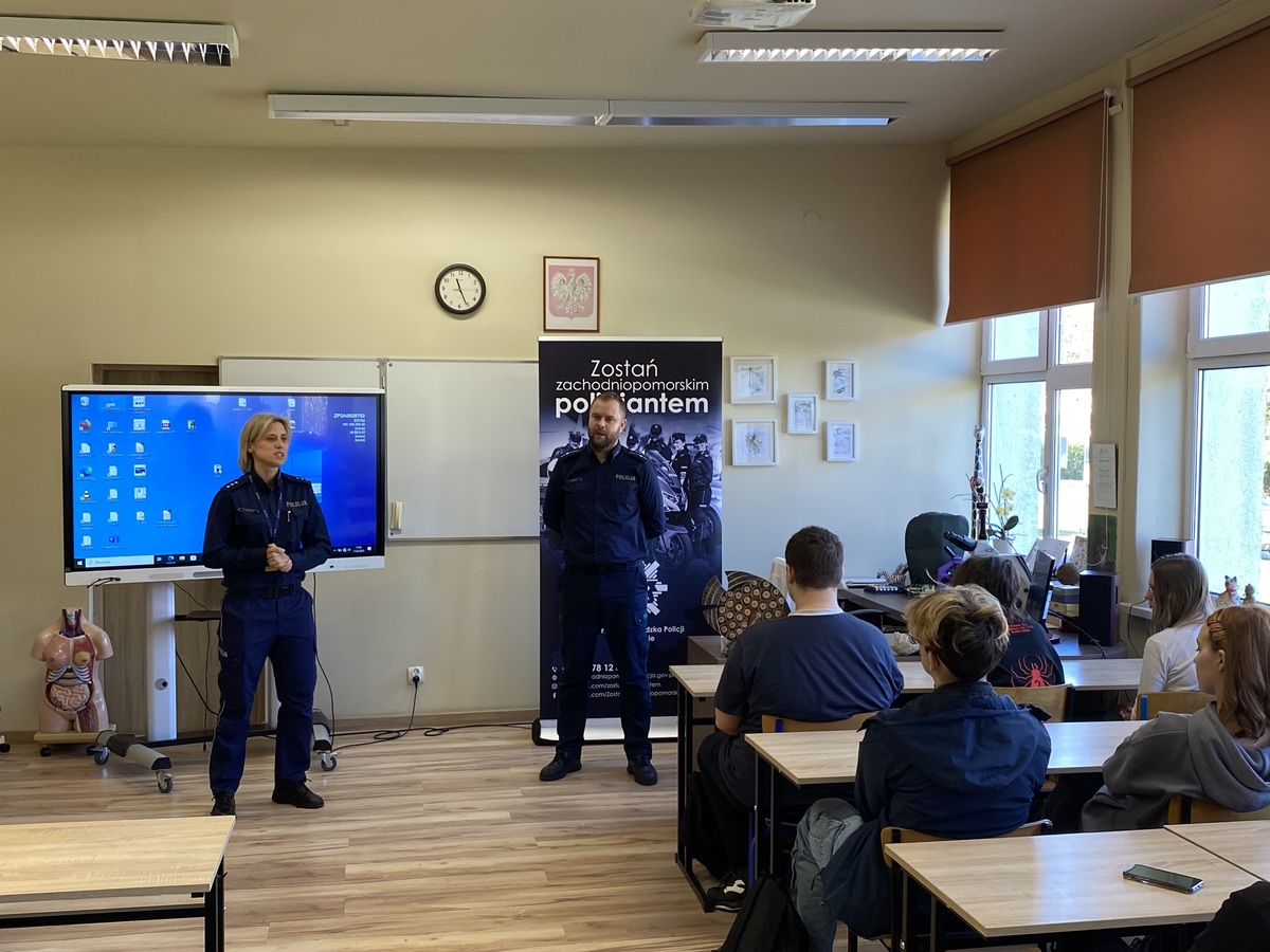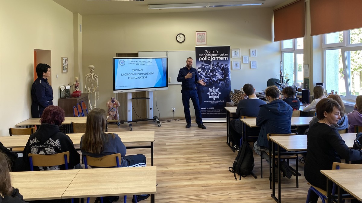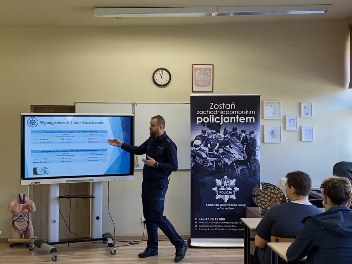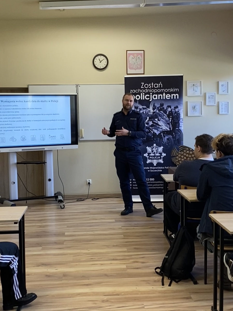 Funkcjonariusz Komendy Wojewódzkiej Policji w Szczecinie przybliżył uczestnikom jakie możliwości daje praca w Policji, a także jakie wymogi należy spełnić, aby przystąpić do postępowania kwalifikacyjnego. Ponadto omówił poszczególne etapy rekrutacyjne, które należy przejść aby rozpocząć służbę w Policji, a także poinformowal uczniów o możliwości podjęcia studiów na Akademii Policji w Szczytnie. mł. asp. Mariusz Bzdak podkreślił, że dokumenty można składać przez cały rok, w każdej jednostce Policji, a od dnia 15 marca br. istnieje możliwość złożenia dokumentów elektronicznie poprzez platformę e-PUAP. Policjanci omówili tematykę, która najbardziej ciekawiła młodzież, a więc uposażenie oraz ścieżki awansu funkcjonariuszy po ukończonym szkoleniu zawodowym podstawowym. Niewątpliwie ilość możliwości rozwoju zaskoczyła uczestniczących w spotkaniu i skłoniła ich do refleksji. Funkcjonariusze zwrócili również uwagę, że Komenda Wojewódzka Policji w Szczecine oferuje możliwość treningu nad poszczególnymi etapami rekrutacji np. testu sprawności fizycznej oraz testów psychologicznych, co znacznie ułatwi potencjalnym kandydatom do służby pomyślne przejście kwalifikacji.