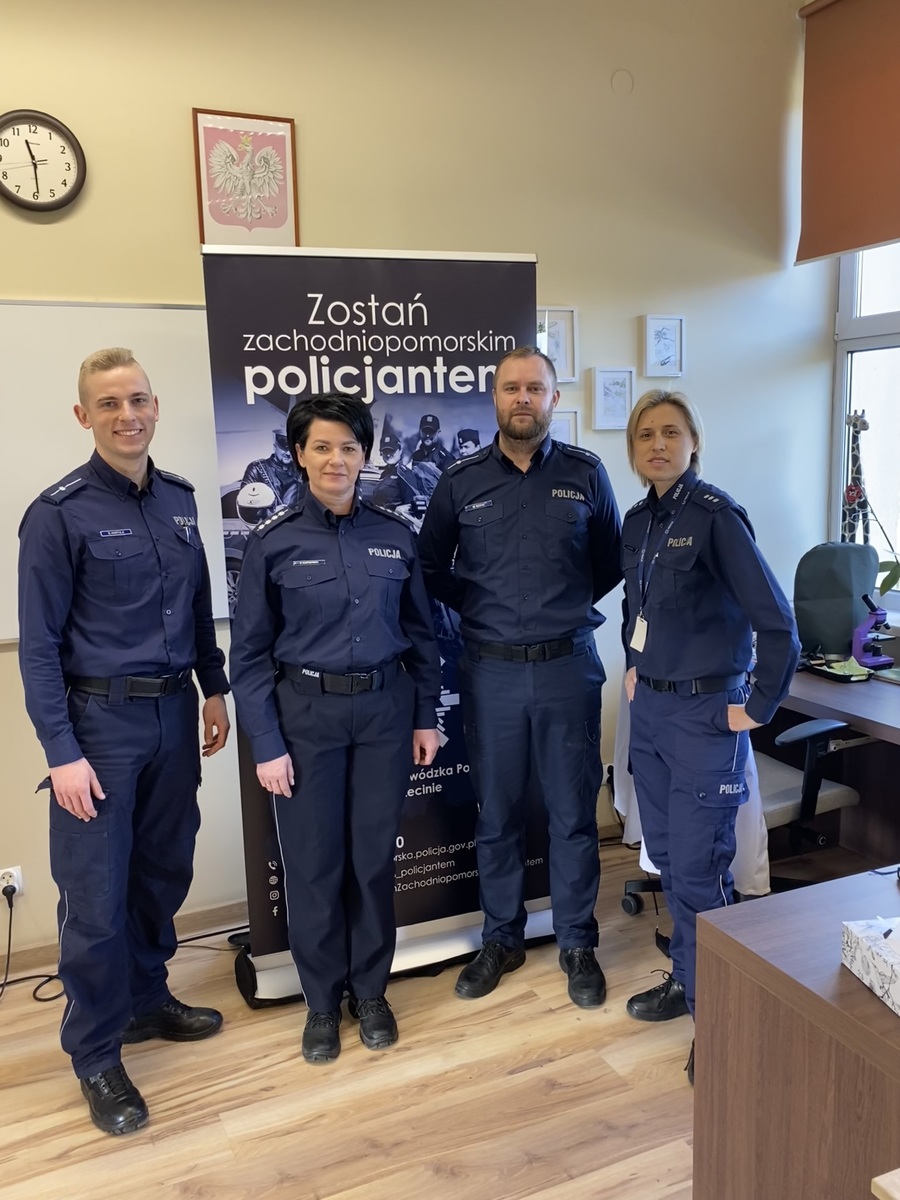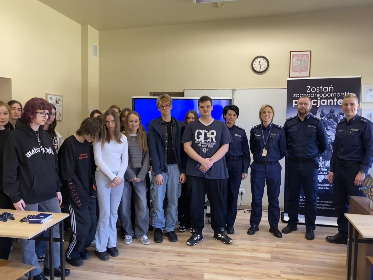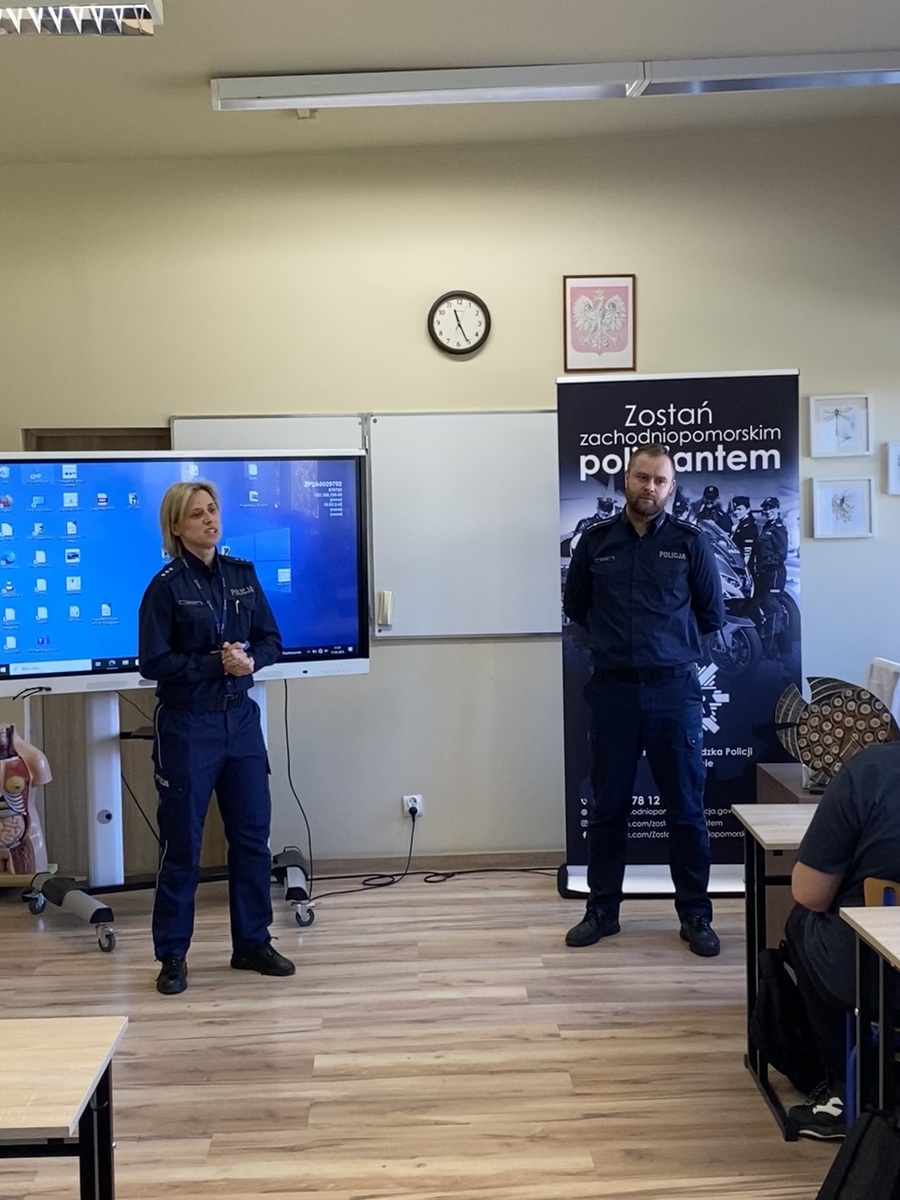 Funkcjonariusz Komendy Wojewódzkiej Policji w Szczecinie przybliżył uczestnikom jakie możliwości daje praca w Policji, a także jakie wymogi należy spełnić, aby przystąpić do postępowania kwalifikacyjnego. Ponadto omówił poszczególne etapy rekrutacyjne, które należy przejść aby rozpocząć służbę w Policji, a także poinformowal uczniów o możliwości podjęcia studiów na Akademii Policji w Szczytnie. mł. asp. Mariusz Bzdak podkreślił, że dokumenty można składać przez cały rok, w każdej jednostce Policji, a od dnia 15 marca br. istnieje możliwość złożenia dokumentów elektronicznie poprzez platformę e-PUAP. Policjanci omówili tematykę, która najbardziej ciekawiła młodzież, a więc uposażenie oraz ścieżki awansu funkcjonariuszy po ukończonym szkoleniu zawodowym podstawowym. Niewątpliwie ilość możliwości rozwoju zaskoczyła uczestniczących w spotkaniu i skłoniła ich do refleksji. Funkcjonariusze zwrócili również uwagę, że Komenda Wojewódzka Policji w Szczecine oferuje możliwość treningu nad poszczególnymi etapami rekrutacji np. testu sprawności fizycznej oraz testów psychologicznych, co znacznie ułatwi potencjalnym kandydatom do służby pomyślne przejście kwalifikacji.