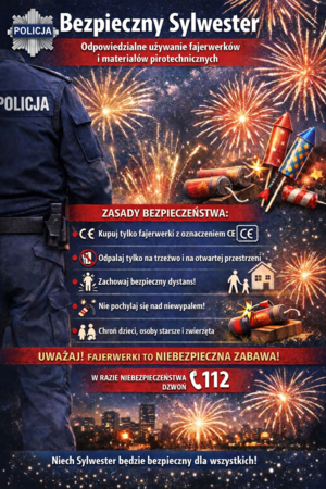 - Sylwester i Nowy Rok - wzajemna odpowiedzialność za zachowanie porządku i bezpieczeństwa Sylwester i Nowy Rok to czas radosnego świętowania oraz spotkań towarzyskich. To również okres, w którym służby odnotowują zwiększoną liczbę zdarzeń związanych z nieodpowiedzialnymi zachowaniami, w tym niewłaściwym używaniem wyrobów pirotechnicznych, zakłócaniem porządku publicznego, czy narażaniem zdrowia i życia innych osób. Dlatego Policja apeluje o rozwagę, odpowiedzialność i przestrzeganie obowiązujących przepisów prawa.